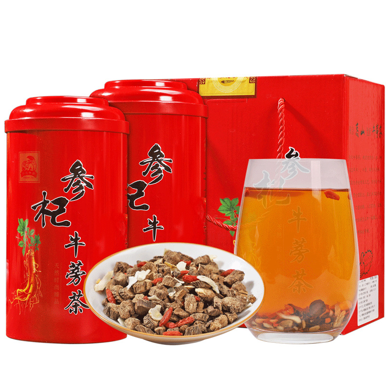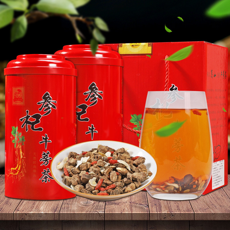 Ginseng, wolfberry, burdock, burdock, burdock root, cow bladder, health tea, iron can, one piece for sale, nourishing and health ginseng, wolfberry, formula