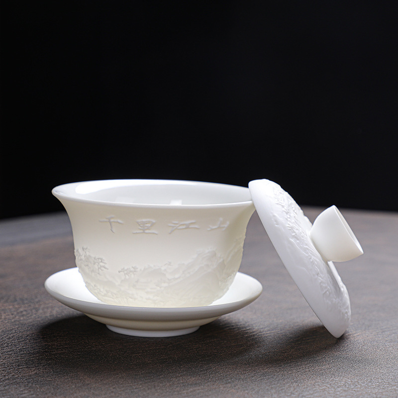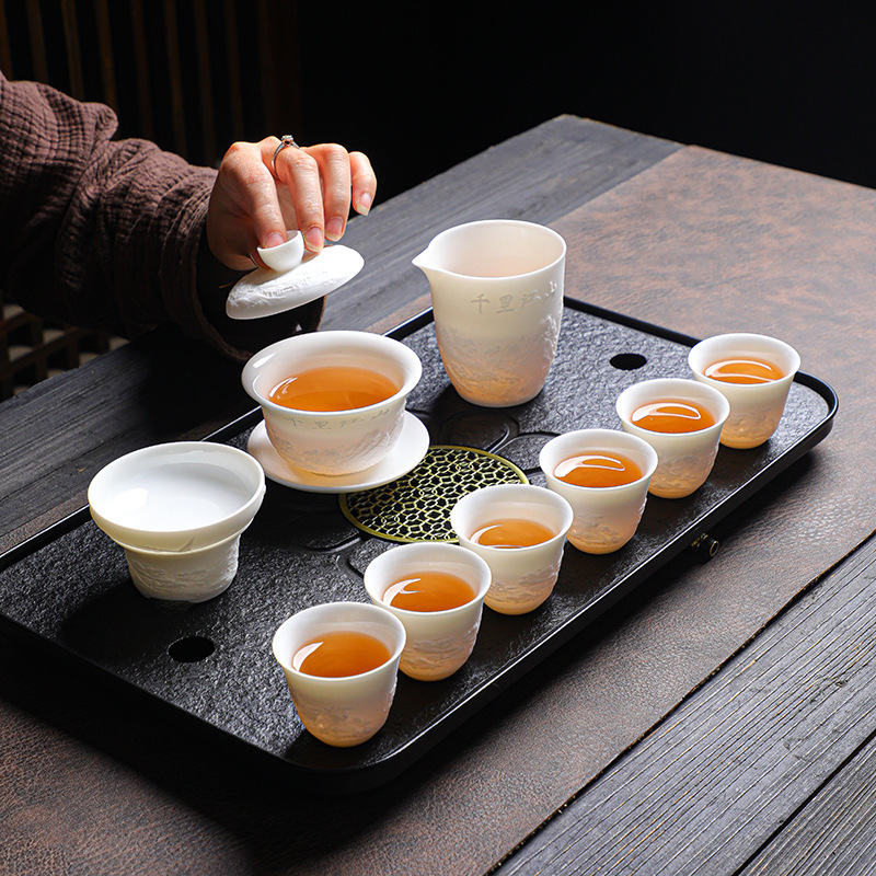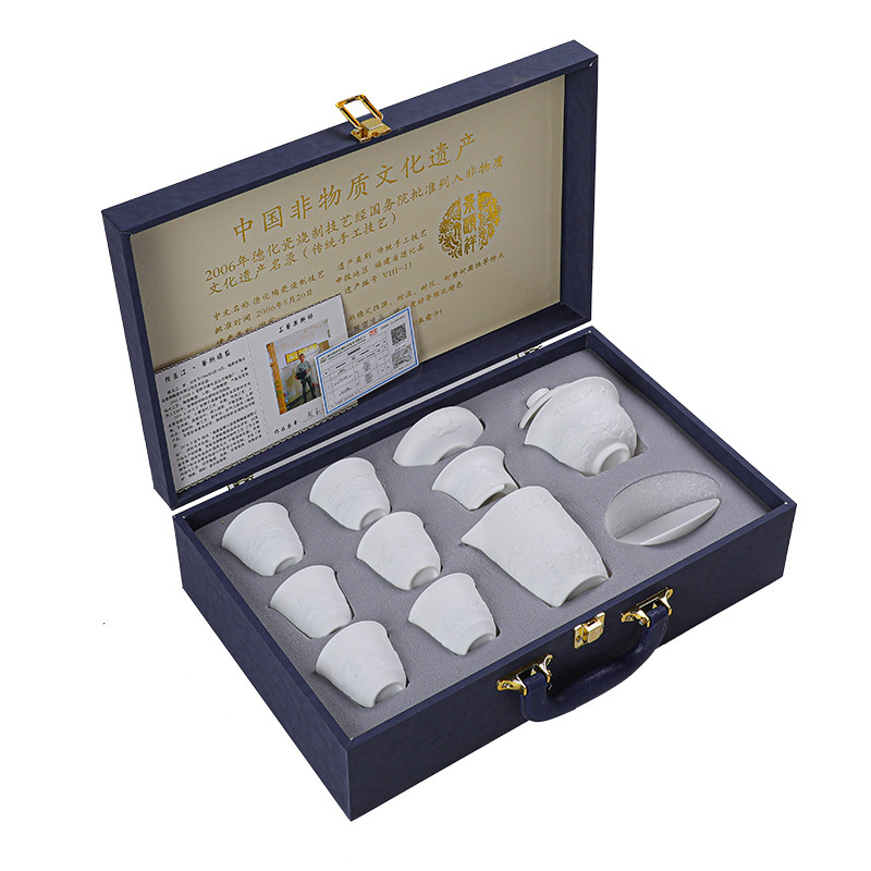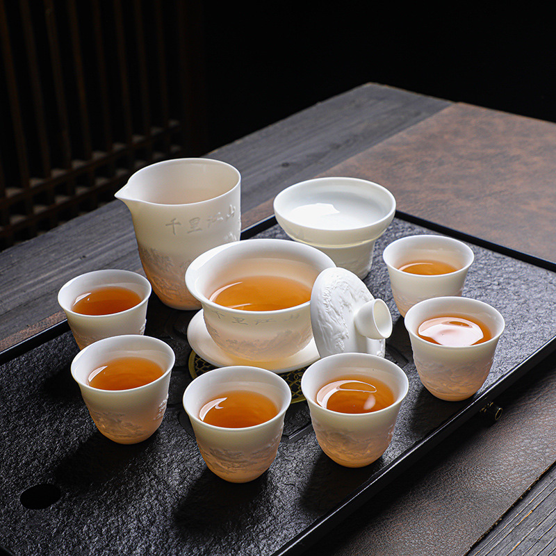德化浮雕羊脂玉功夫茶具套装商务家用送礼礼品整套伴手礼带礼盒