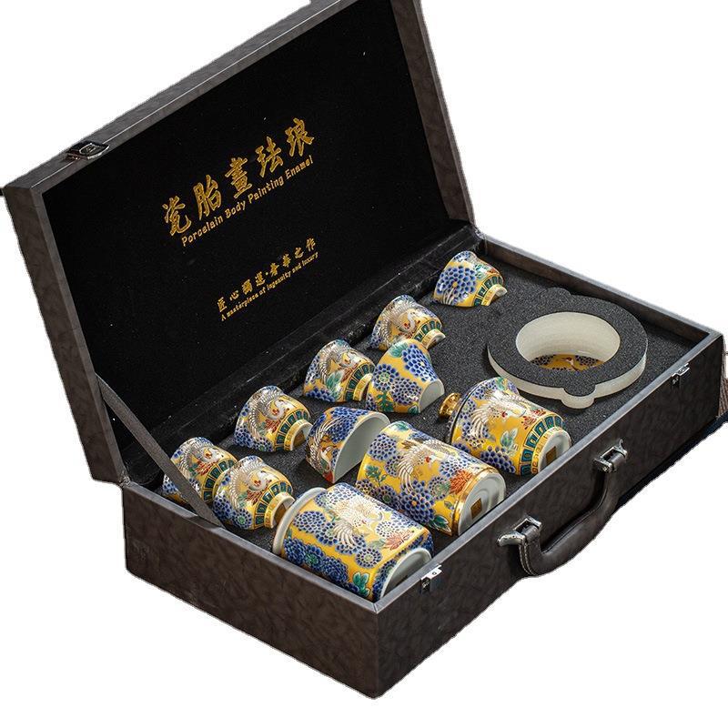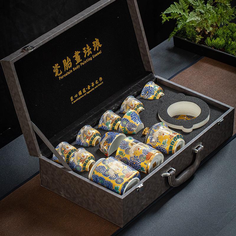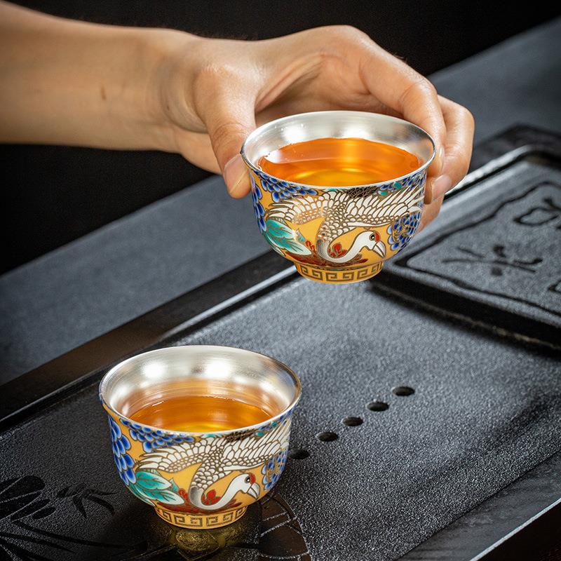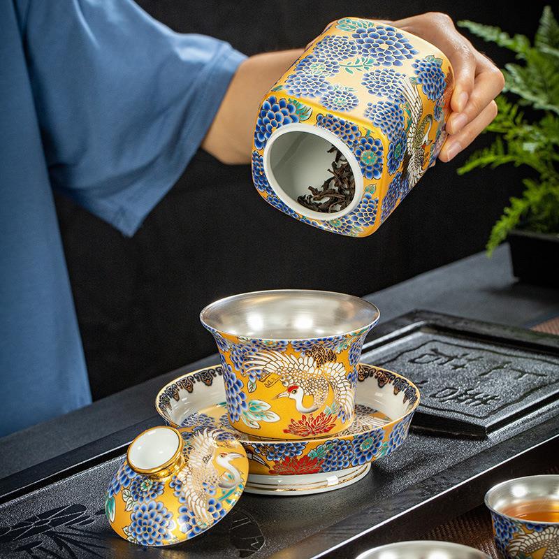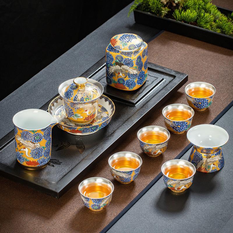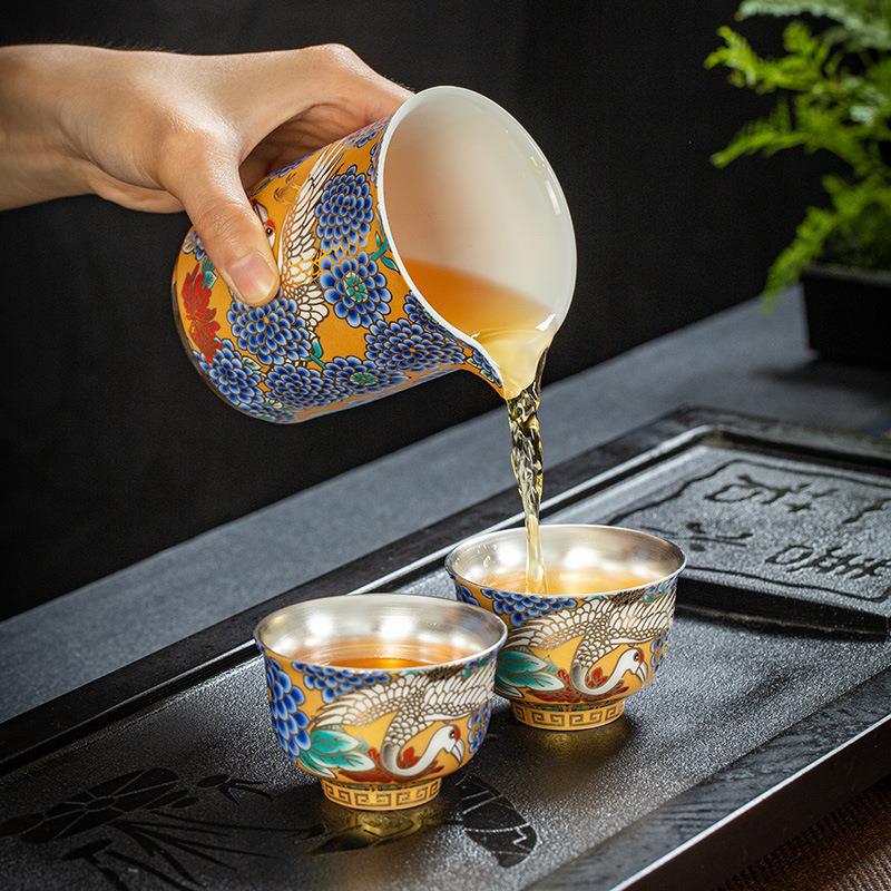 轻奢999鎏银 茶具套装珐琅彩仙鹤盖碗套组功夫茶杯整套家用礼盒装