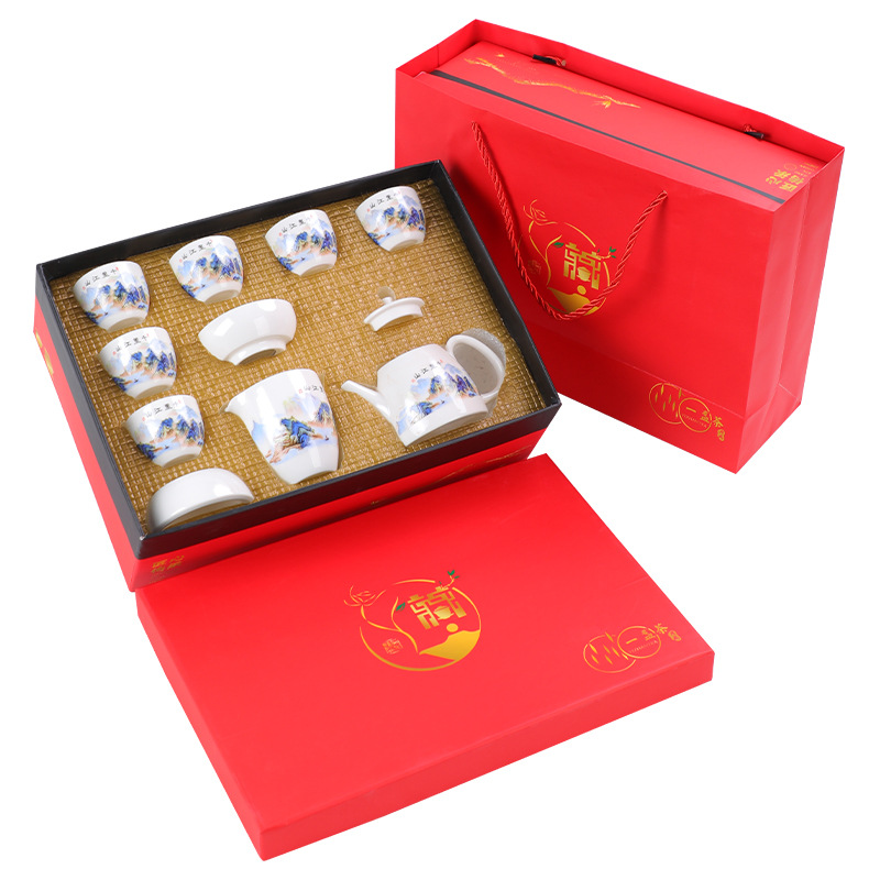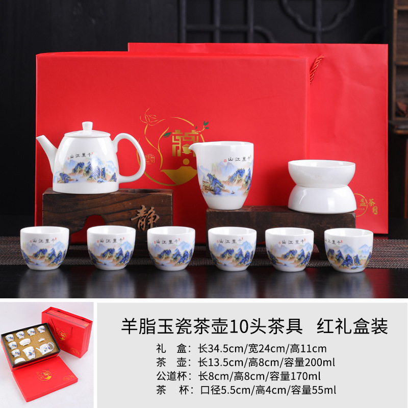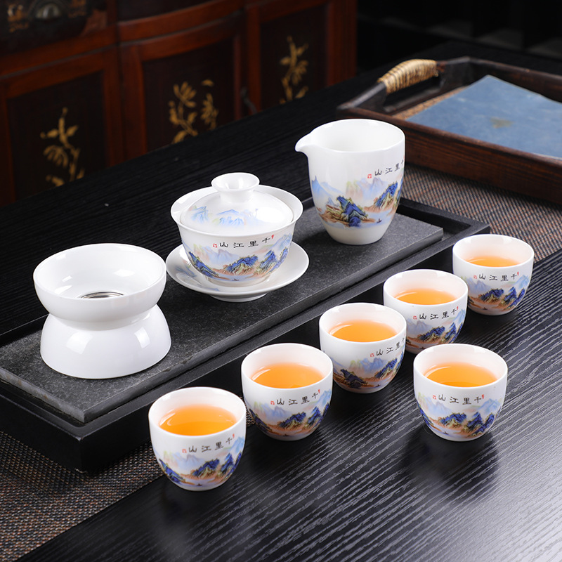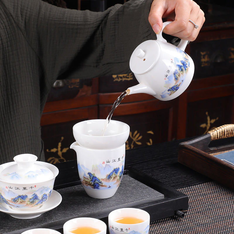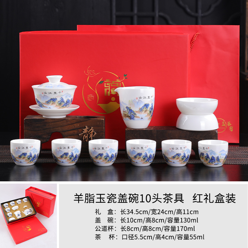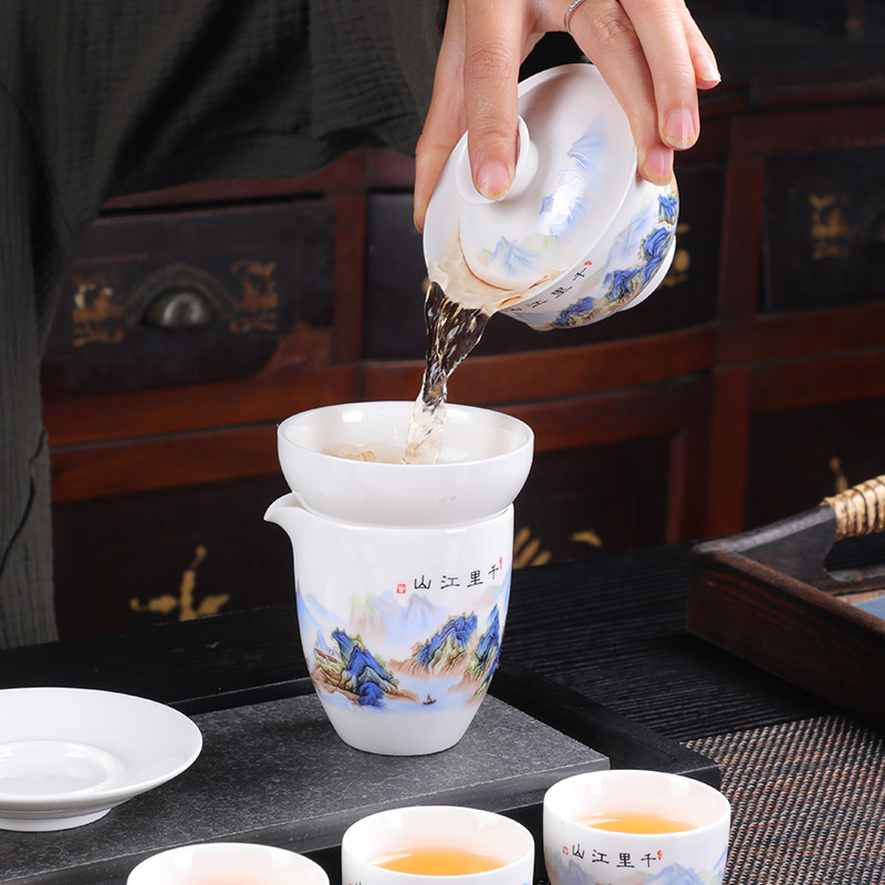 千里江山德化白瓷功夫茶具套装批发礼盒高档旅行茶具盖碗茶杯logo