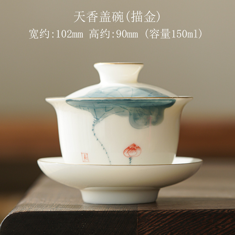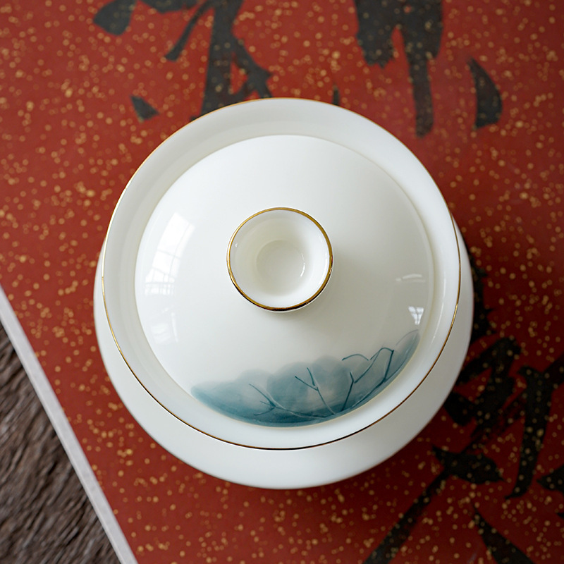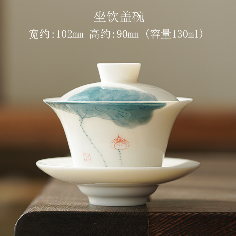 Dehua Yangzhi Jade Sancai Tea Cover Bowl Hand-painted Lotus White Porcelain Household Creative Kung Fu Tea Set Hand-held Tea Bowl