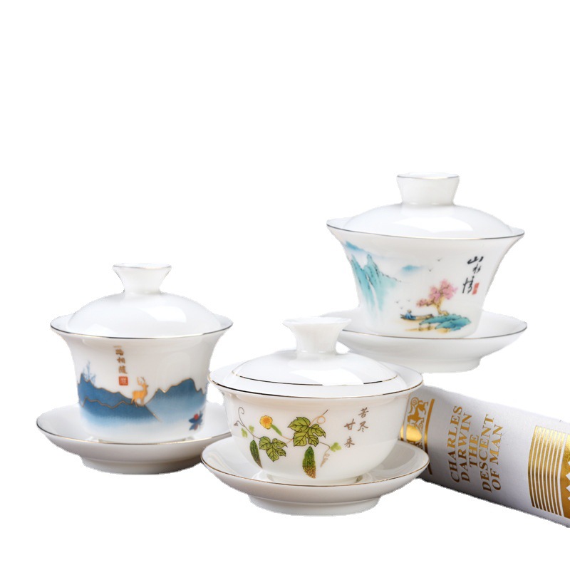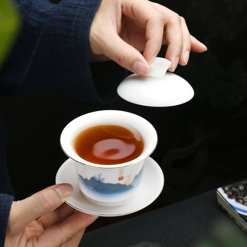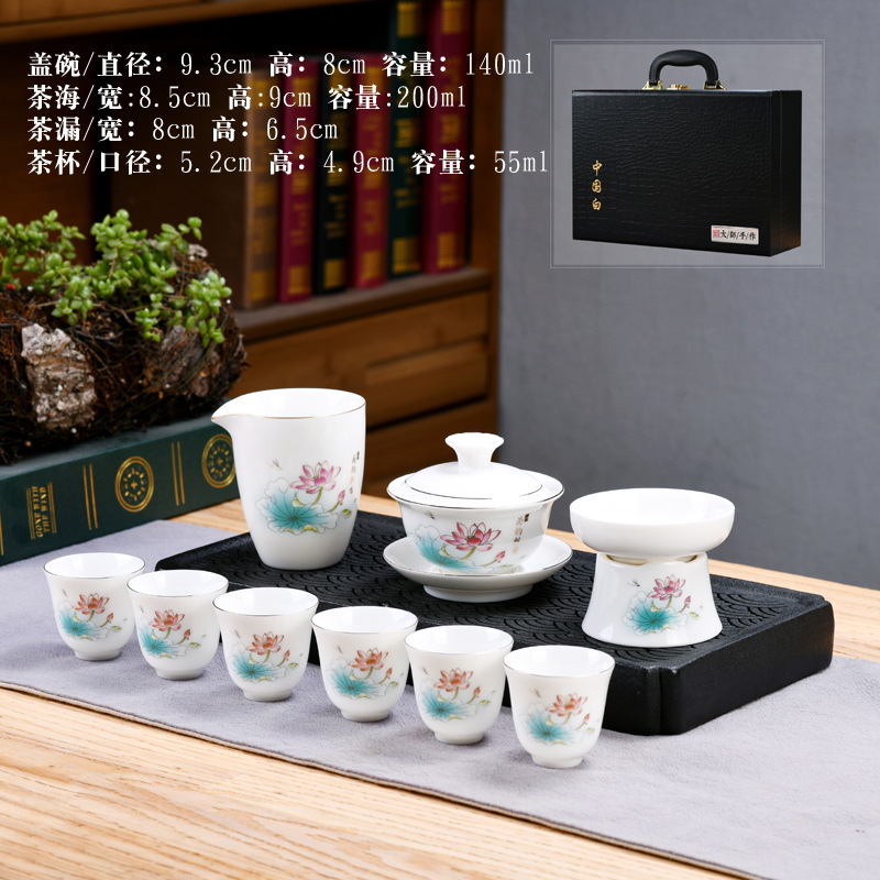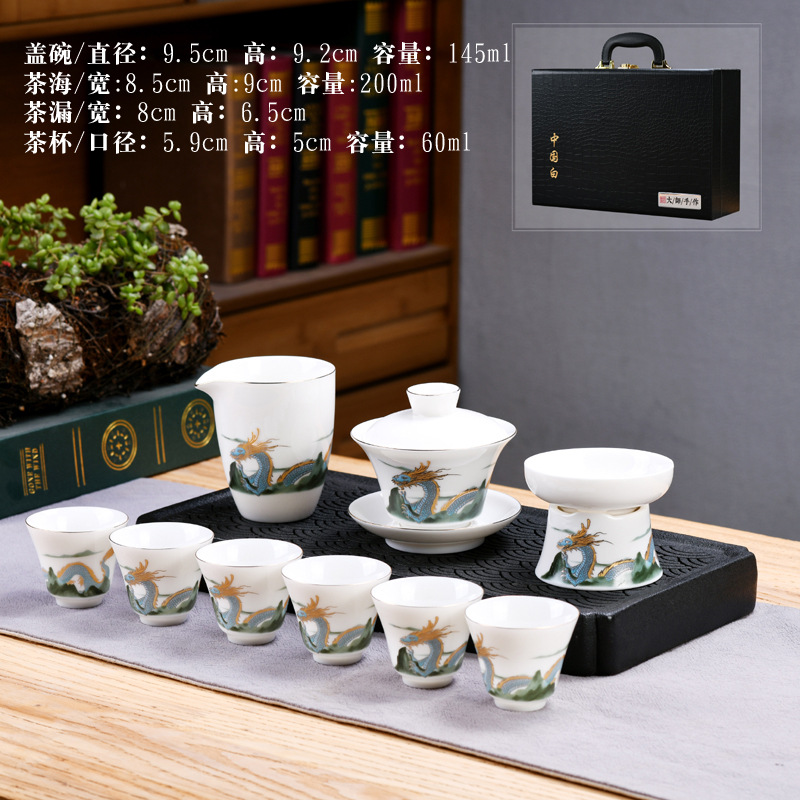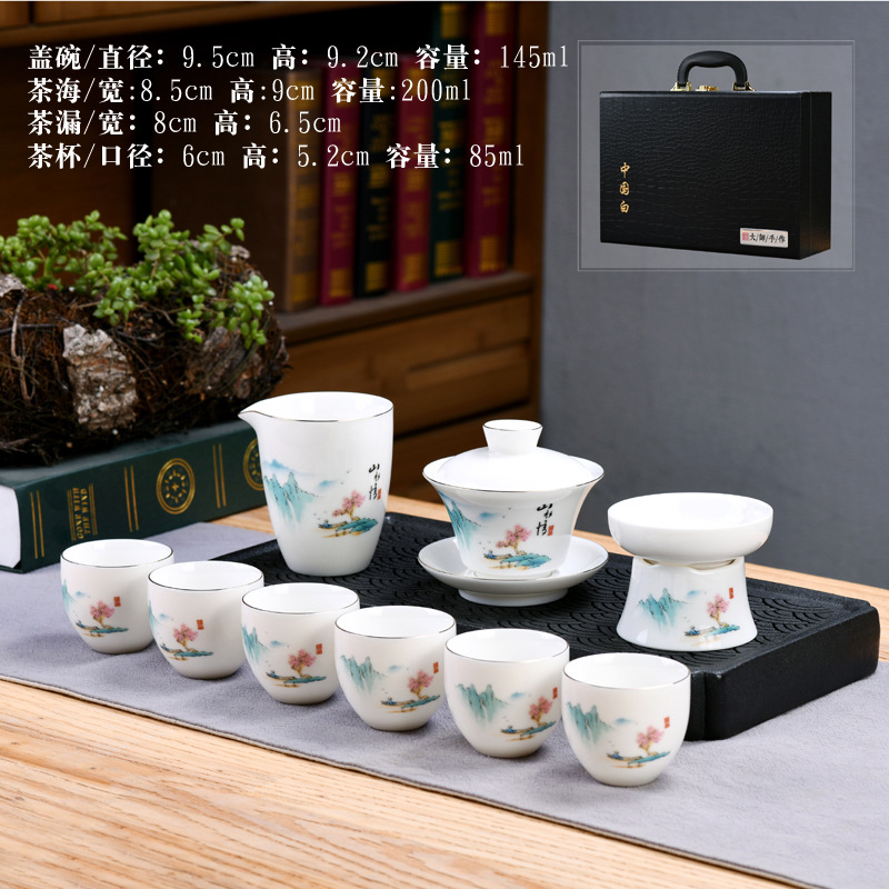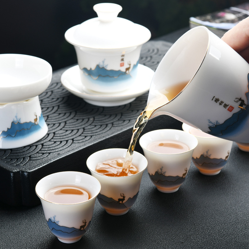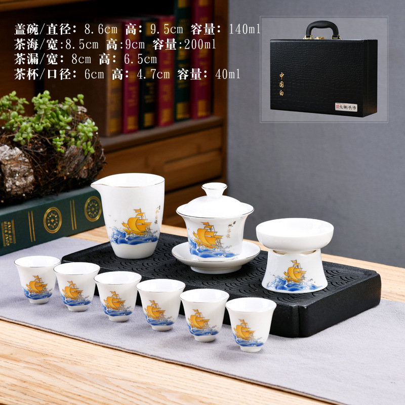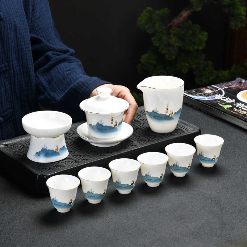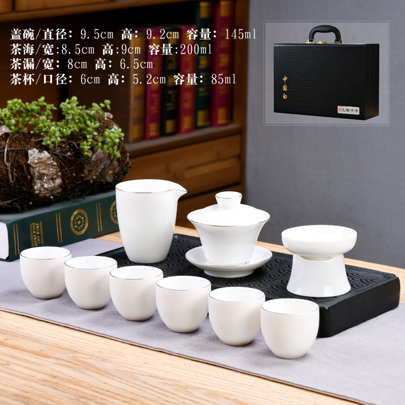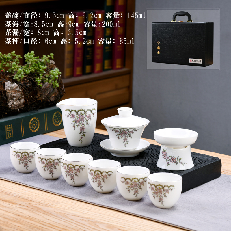 Dehua sheep fat jade kung fu tea set home living room guest office tea cup ceramic gift box national trend gift box