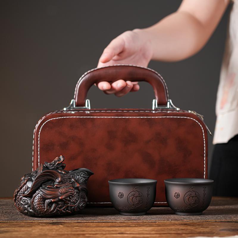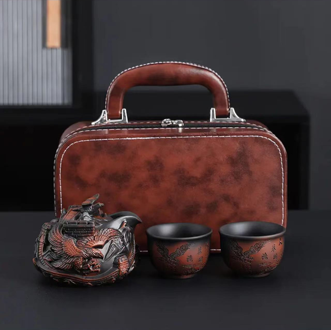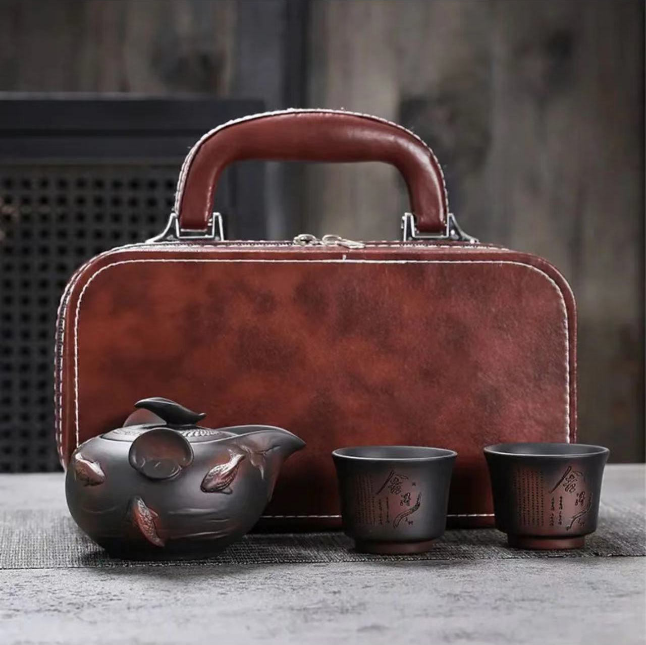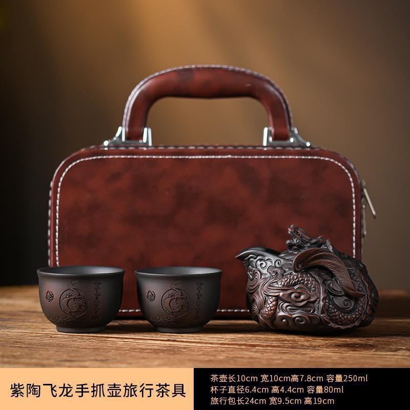 Handmade purple pottery, carved travel tea set, one pot, two cups, portable handheld teapot, outdoor travel tea making
