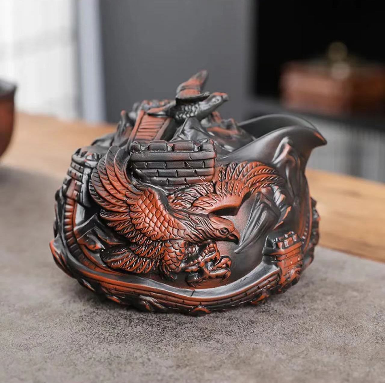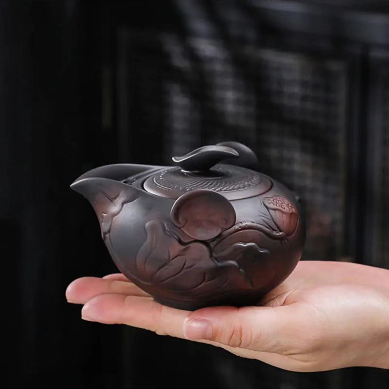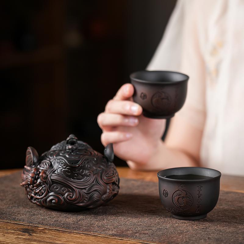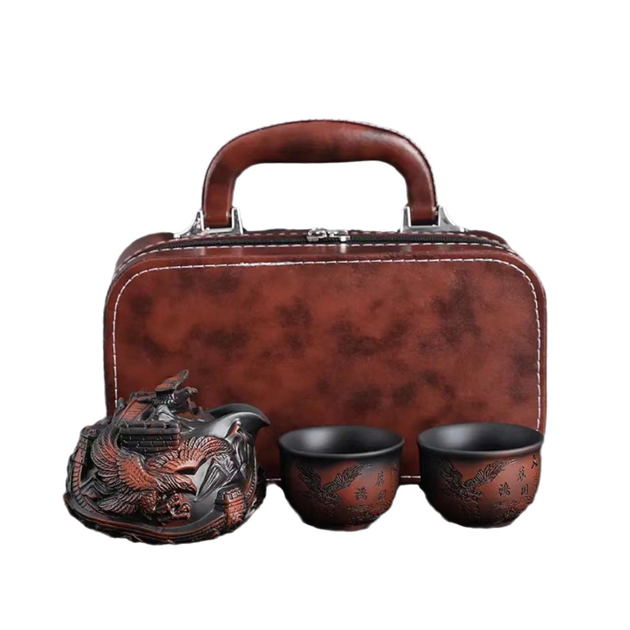 Handmade purple pottery, carved travel tea set, one pot, two cups, portable handheld teapot, outdoor travel tea making