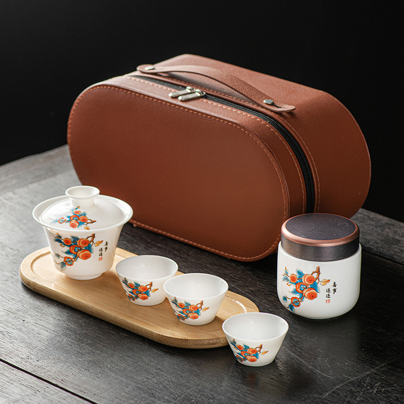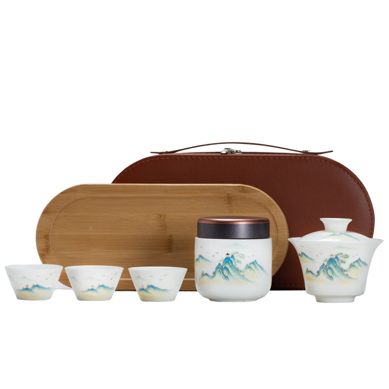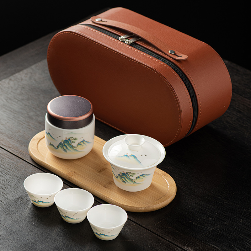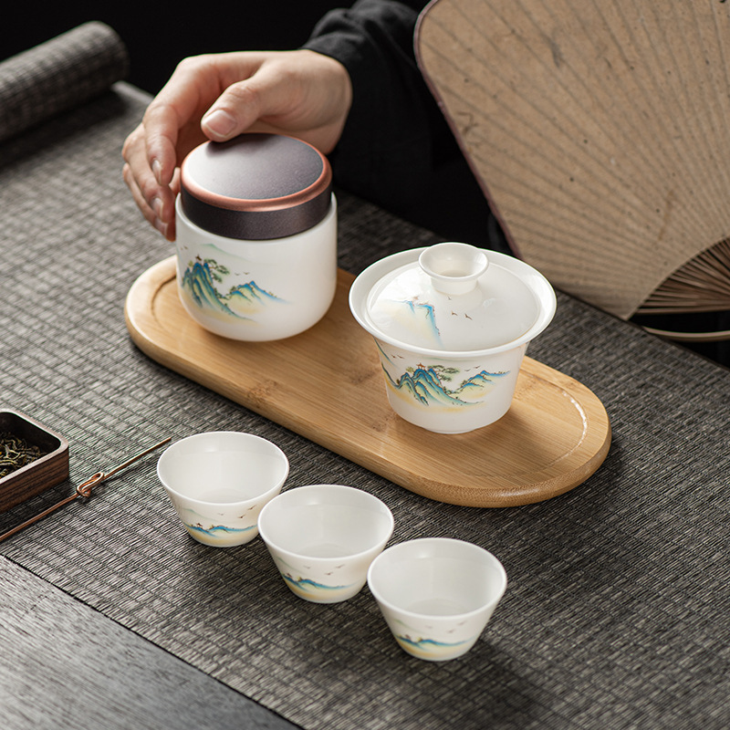 Sheep fat jade white porcelain bamboo plate travel tea set simple portable accompanying bowl cover kung fu tea set business gift