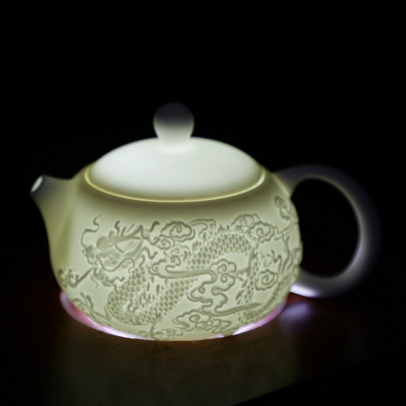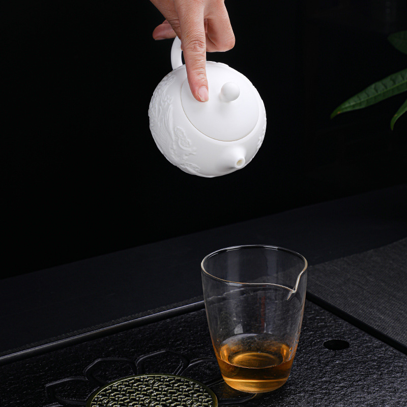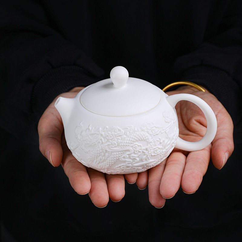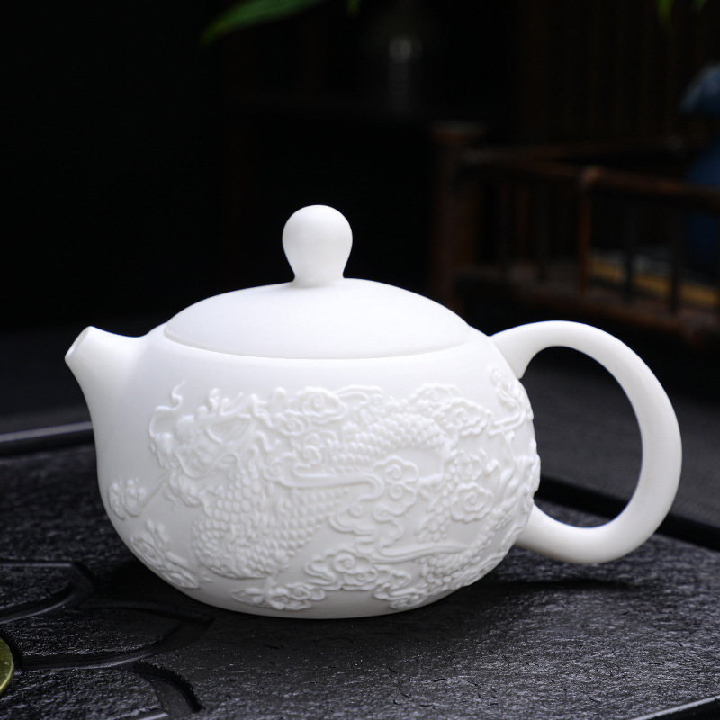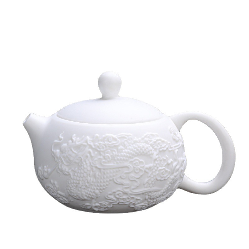 White porcelain embossed Xishi pot Fengming pot sheep fat jade dragon and phoenix auspicious tea pot veggie fired ceramic kung fu tea set business gift