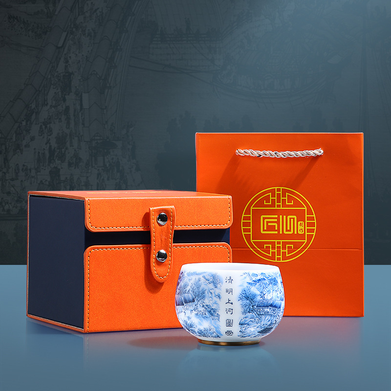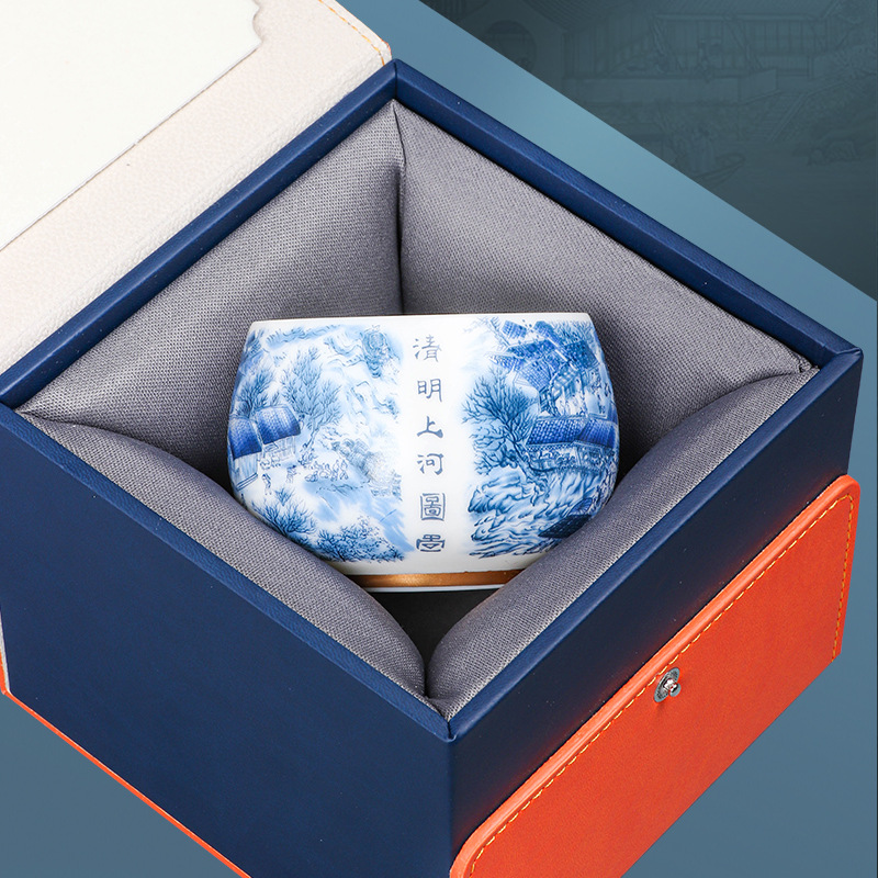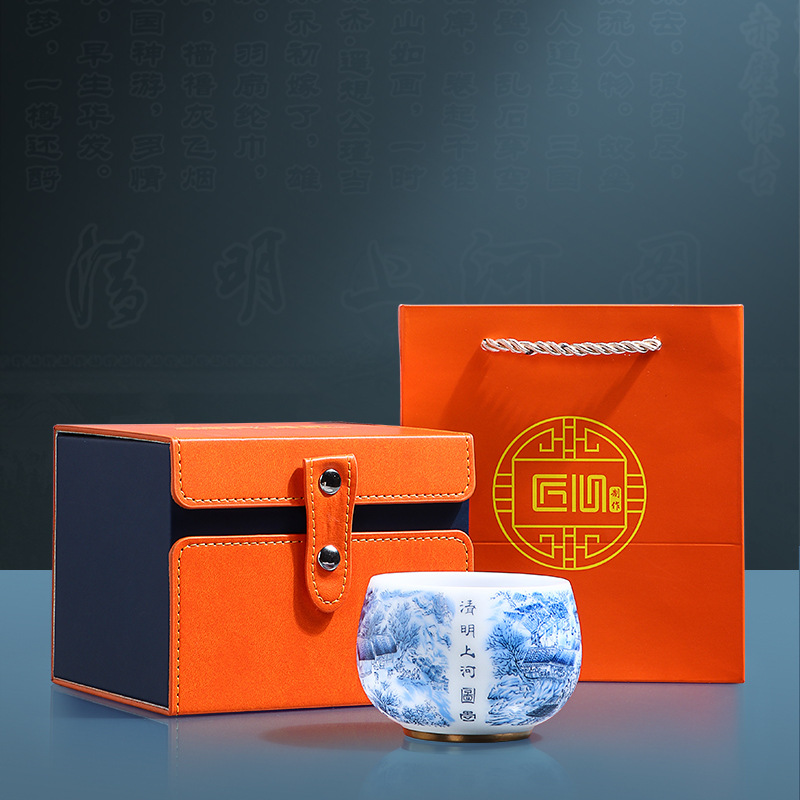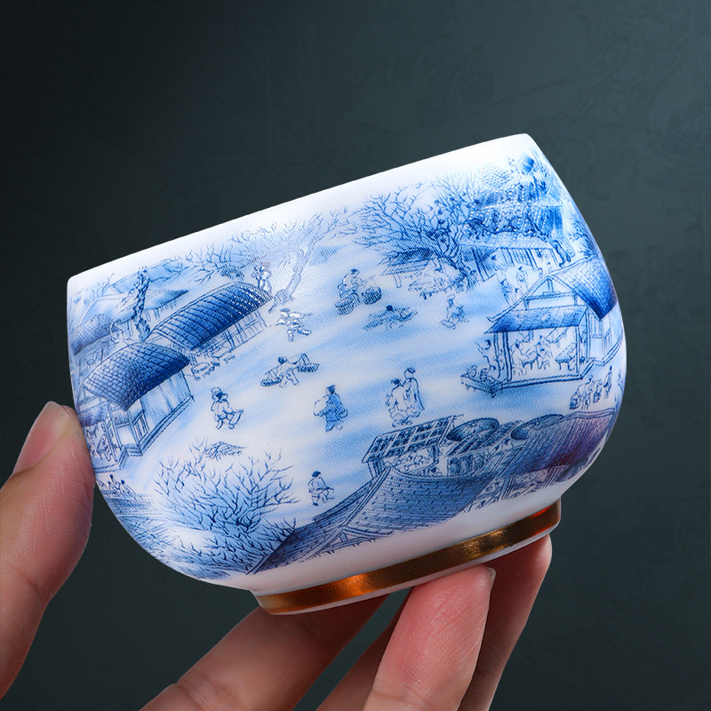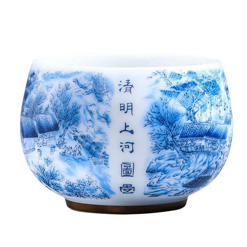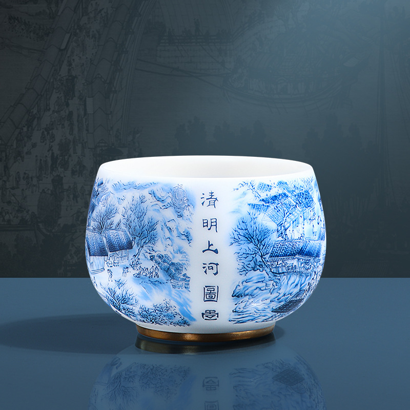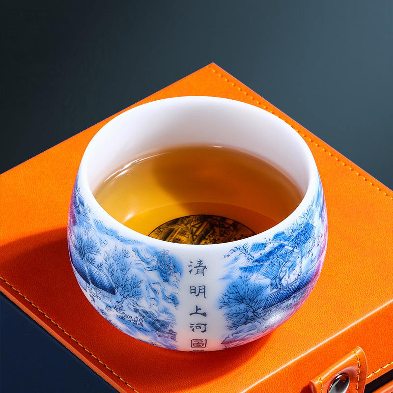 High-end Chinese-style mutton fat jade white porcelain master cup Qingming Shanghe Tu tea cup single cup Kung Fu tea cup tea cup tea tasting cup