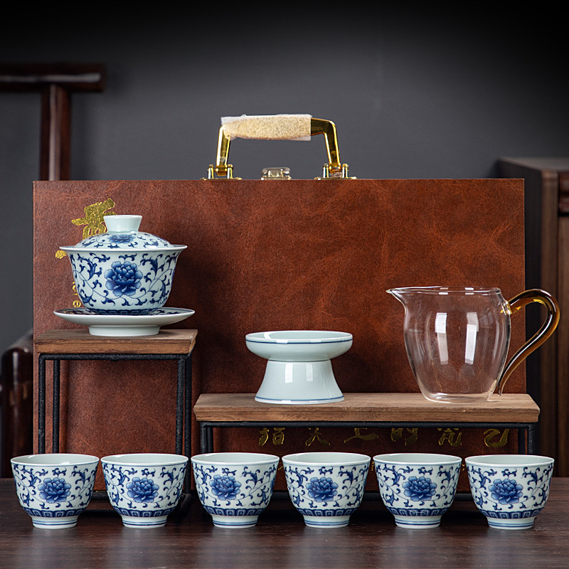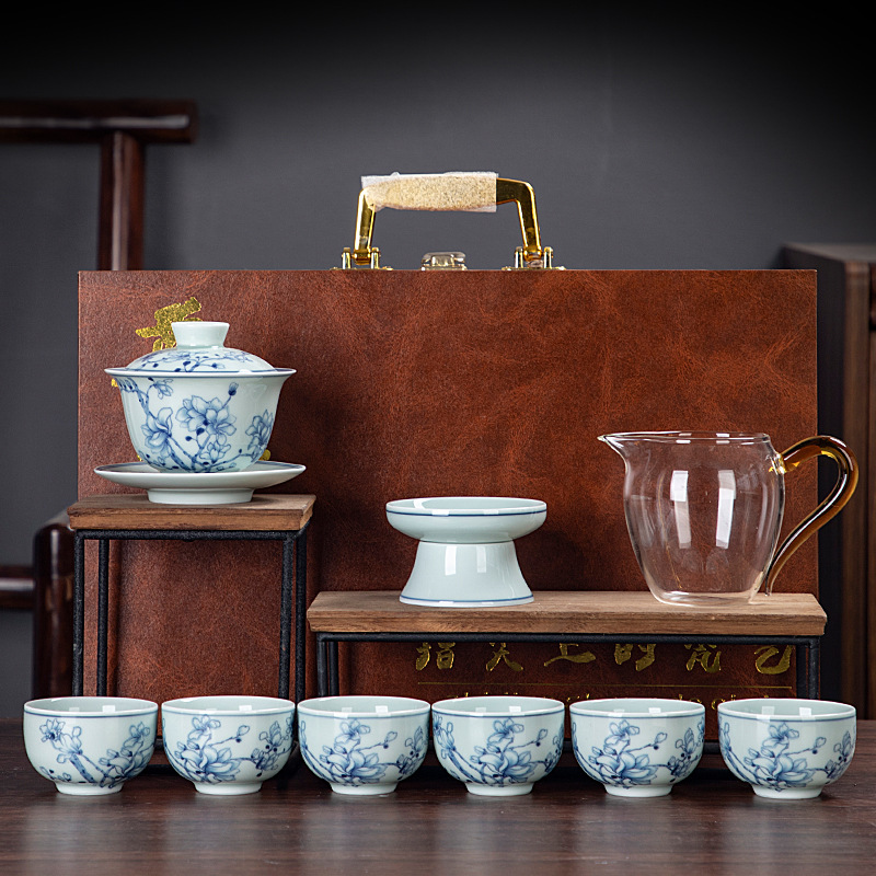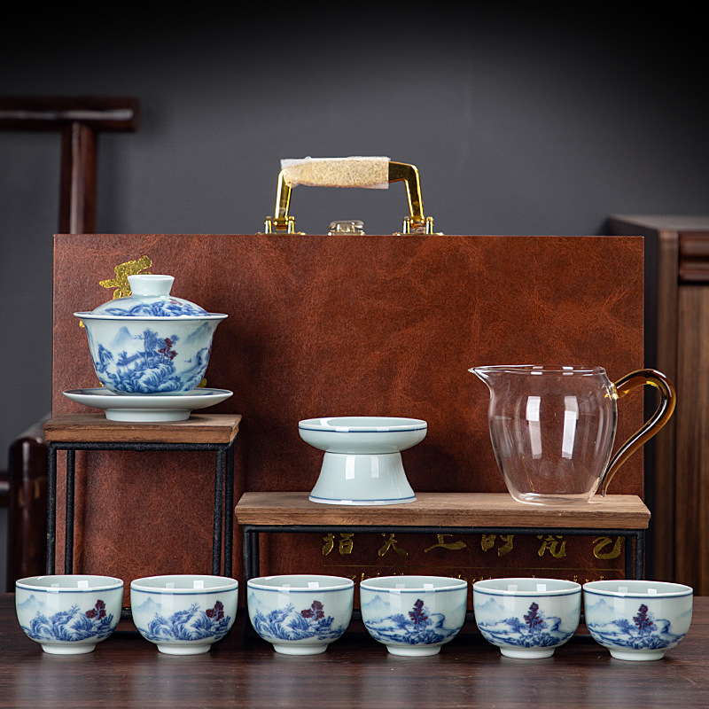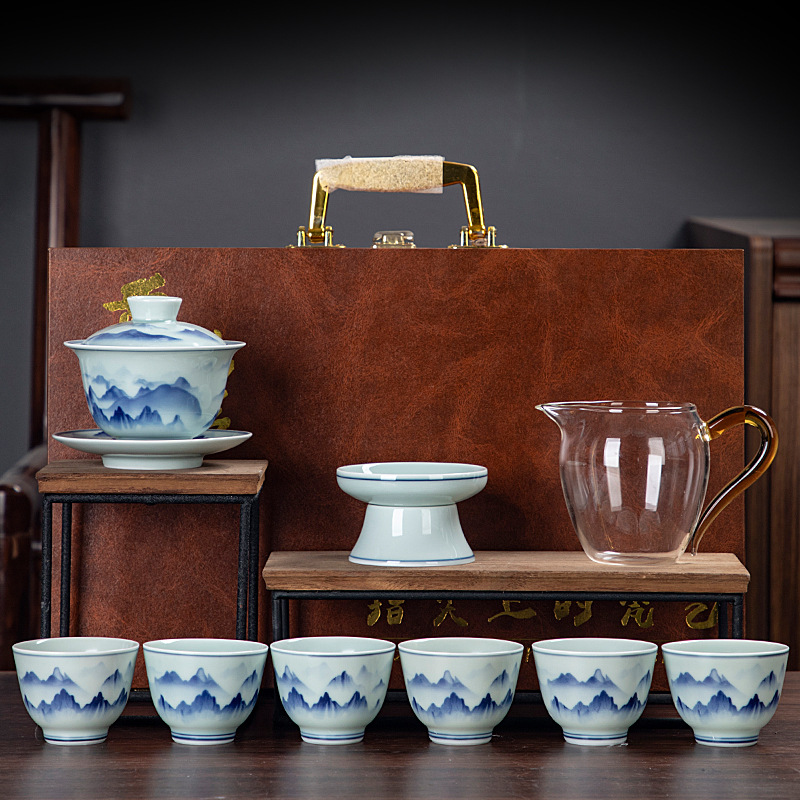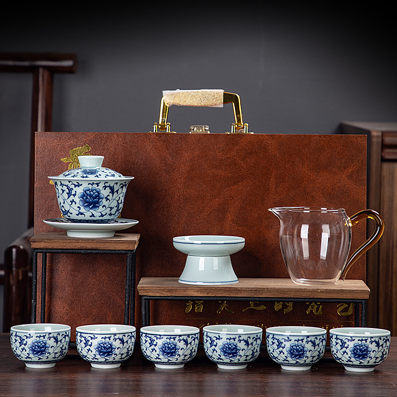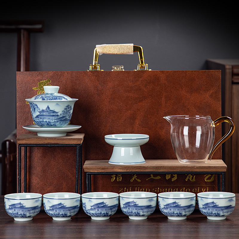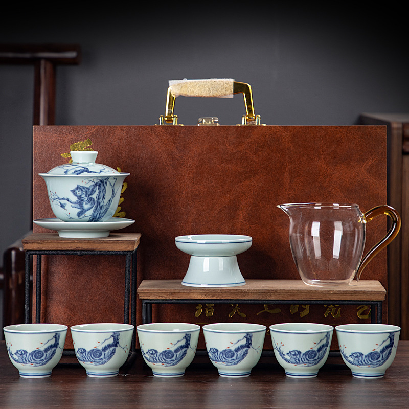 Blue and white glaze ceramic complete set of Kung Fu tea set handmade home business office gift tea maker gift box