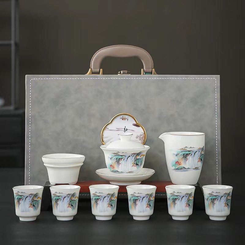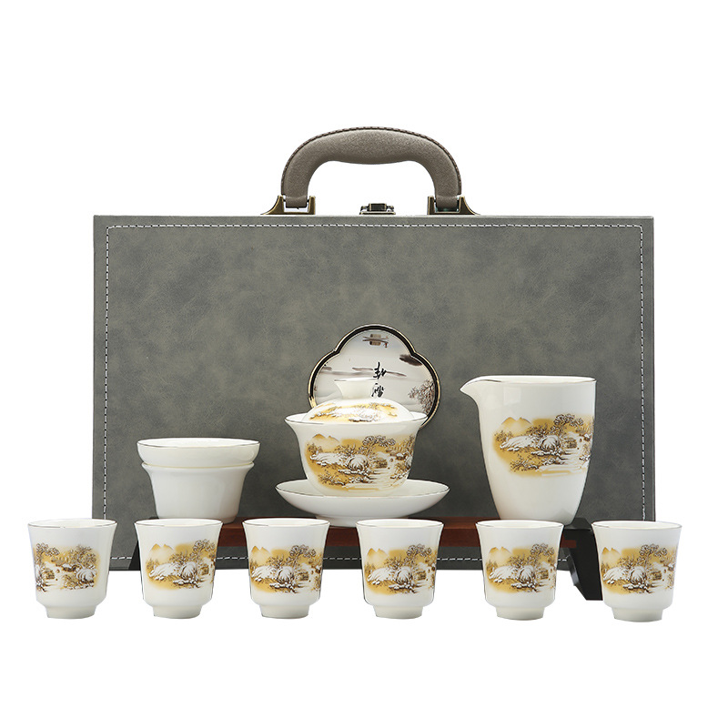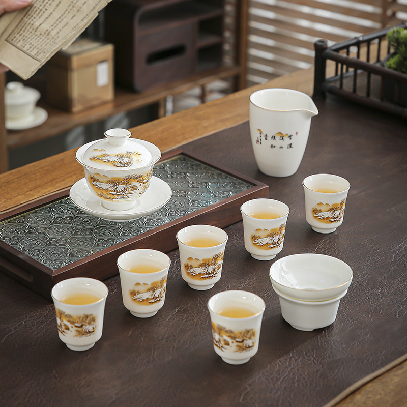 Tea set ceramic lid bowl household simple tea cup sheep fat jade white porcelain kung fu tea set gift box national trend style
