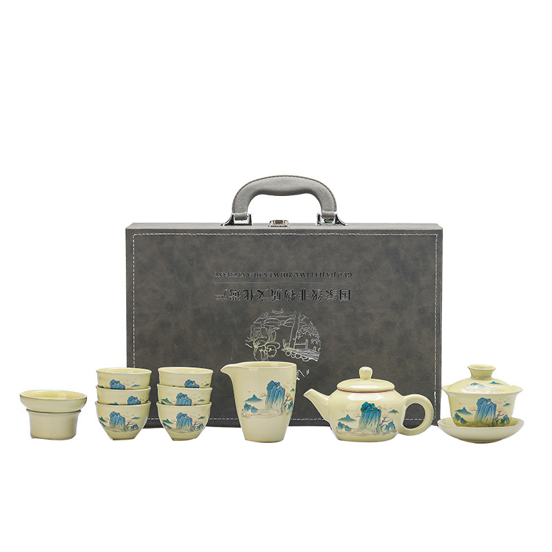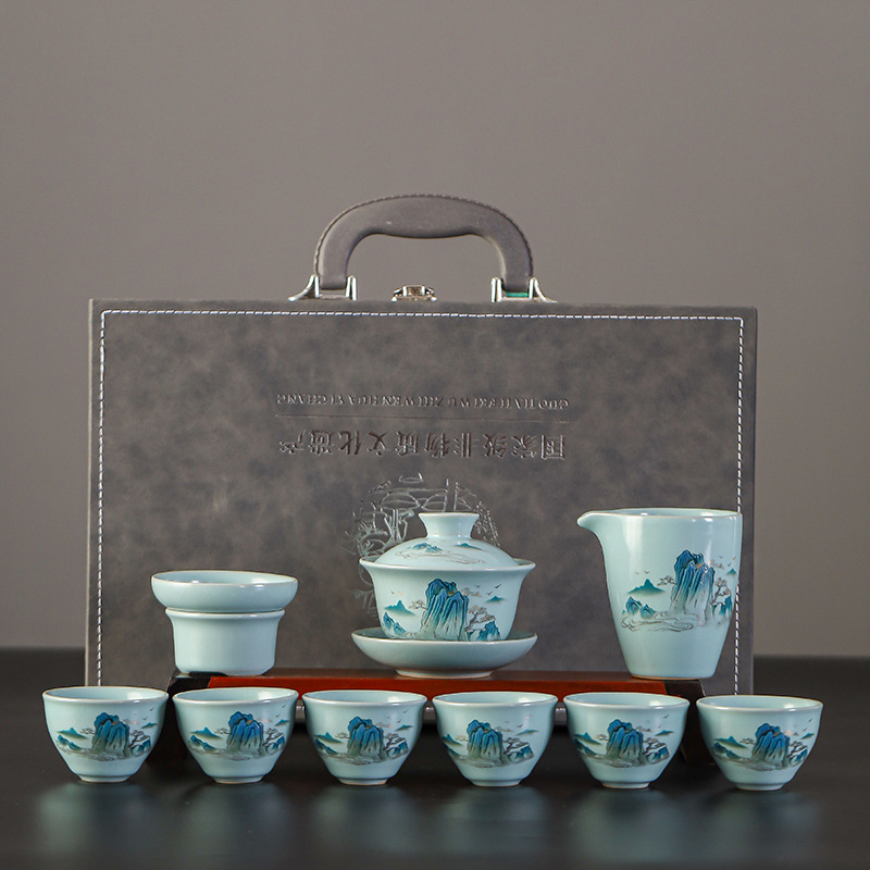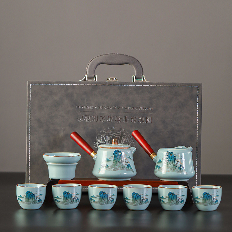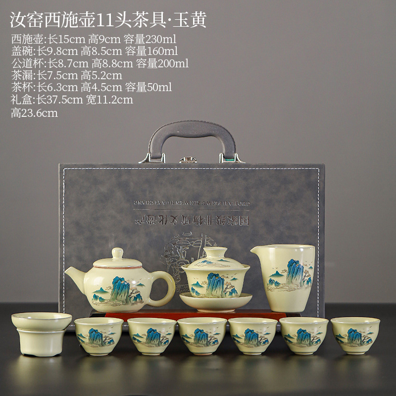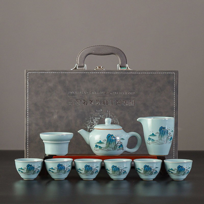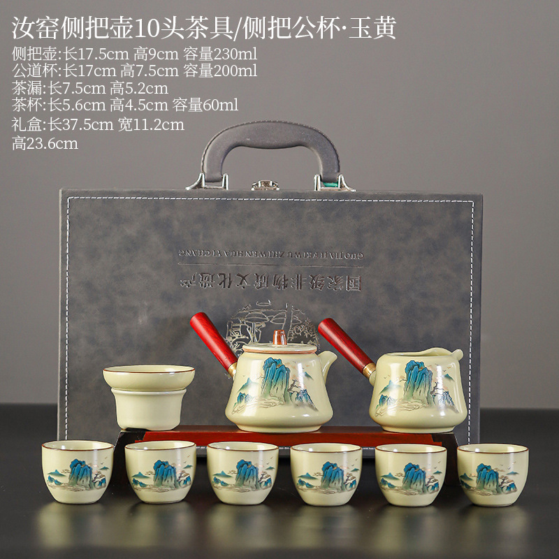 Tianqing Beige Ru kiln open piece high-end teapot cover bowl set ceramic household holiday gift set Kung Fu tea set